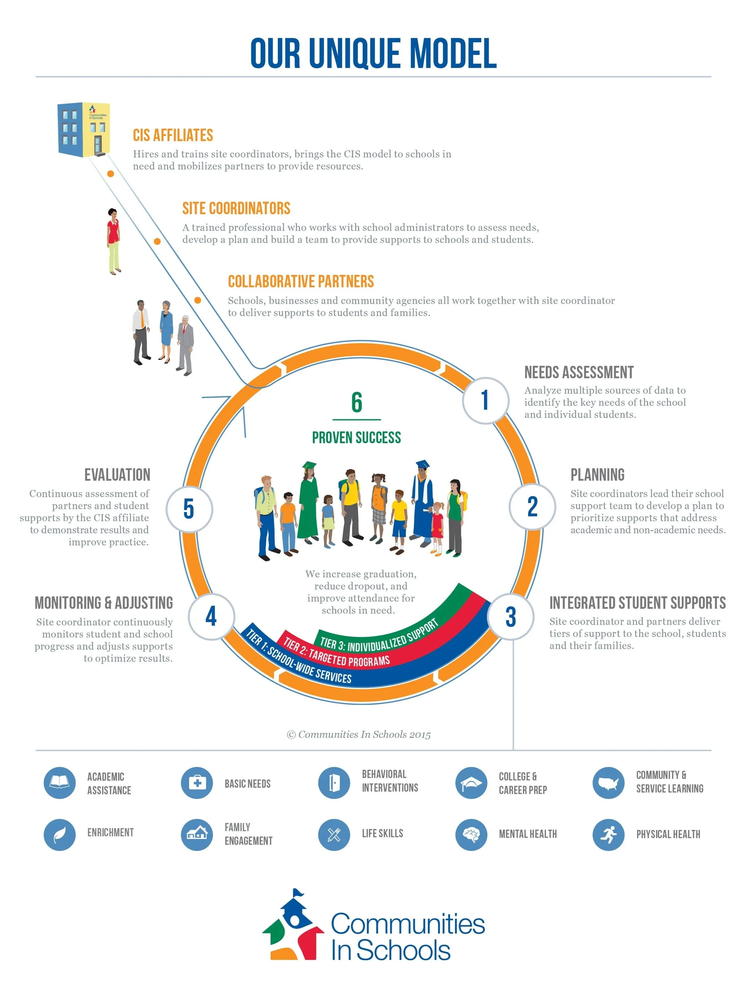 Communities In Schools (CIS) is a national non-profit organization that places site coordinators inside public schools to provide at-risk students with essential resources and support, aiming to reduce dropout rates and improve academic success. They connect students with community resources, such as tutoring, food, clothing, and mental health counseling, ensuring students are prepared to learn.